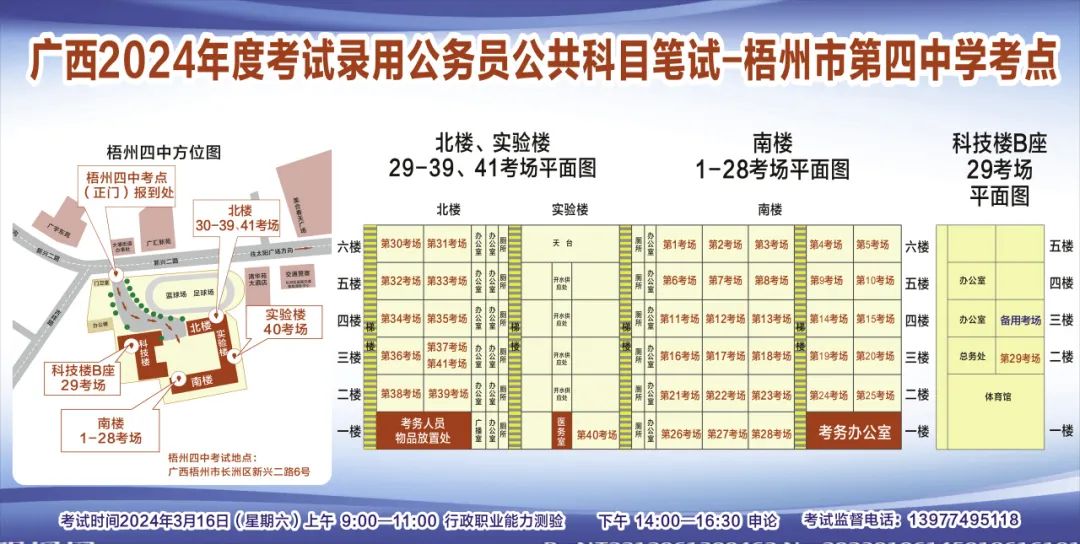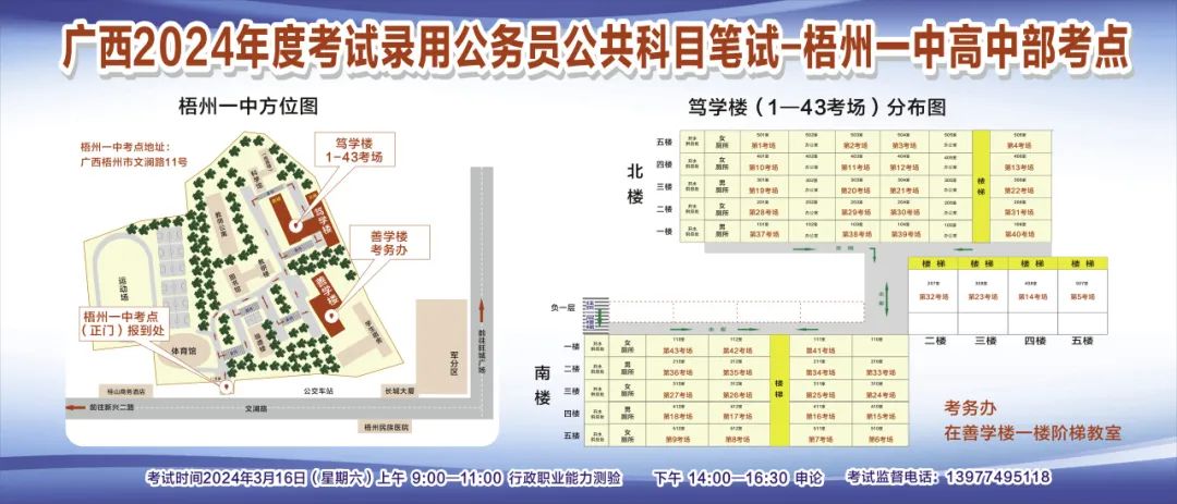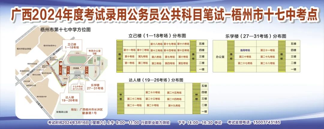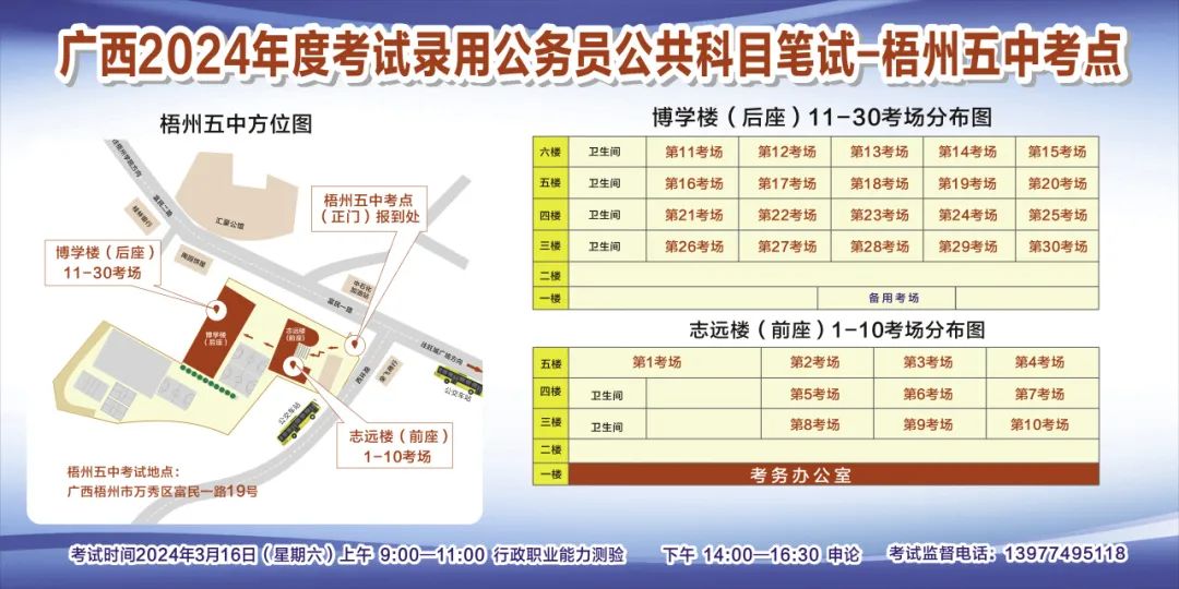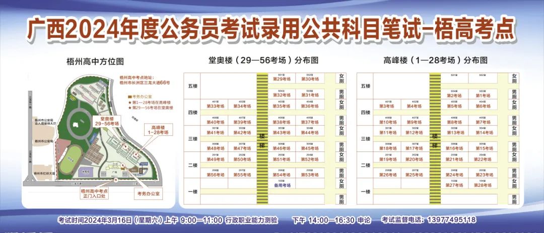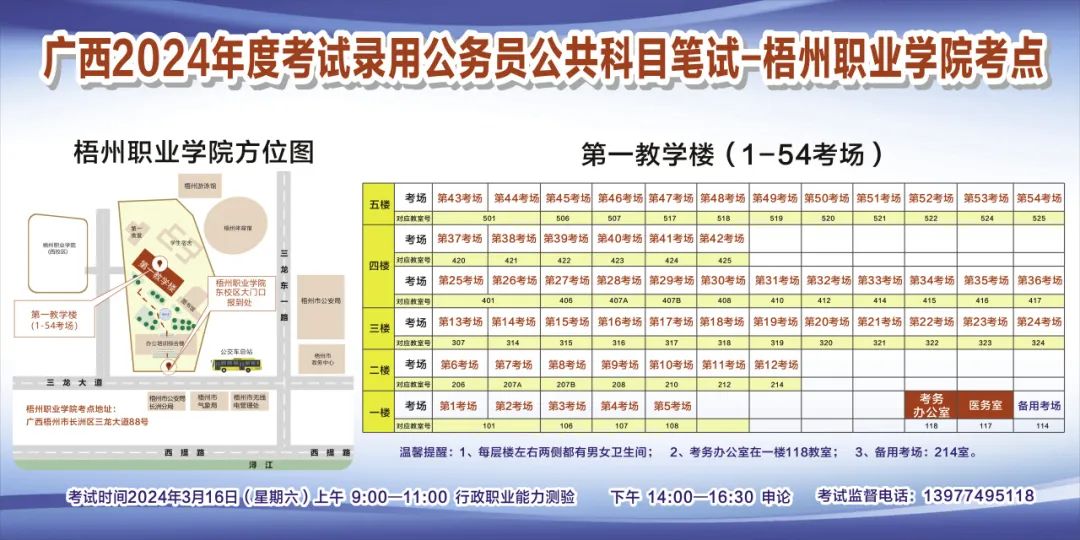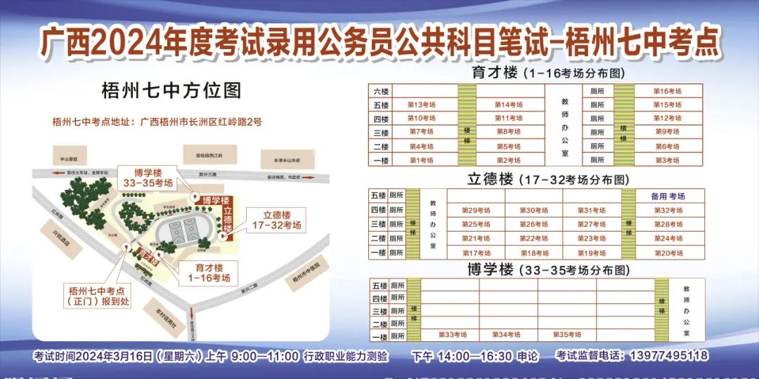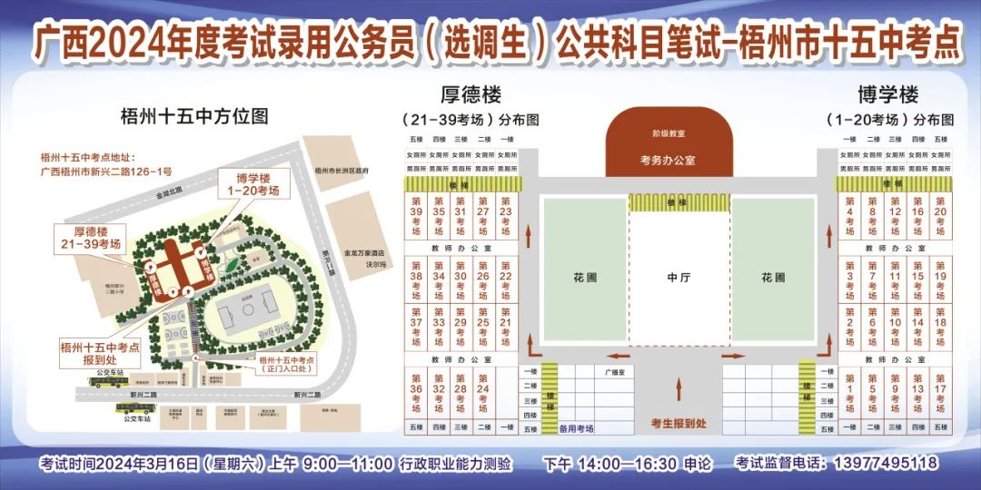 一、廣西2024年度考試錄用公務(wù)員(選調(diào)生)公共科目筆試將于3月16日舉行,梧州考區(qū)共設(shè)置9個(gè)考點(diǎn),請(qǐng)考生提前熟悉各自考點(diǎn)位置、周邊環(huán)境及交通情況,考試當(dāng)天提前出門做好準(zhǔn)備,準(zhǔn)時(shí)參加考試。特別提示:因考點(diǎn)停車場(chǎng)地有限,所有考生車輛不得進(jìn)入考點(diǎn),請(qǐng)考生規(guī)劃好前往考點(diǎn)的交通方式和路線。