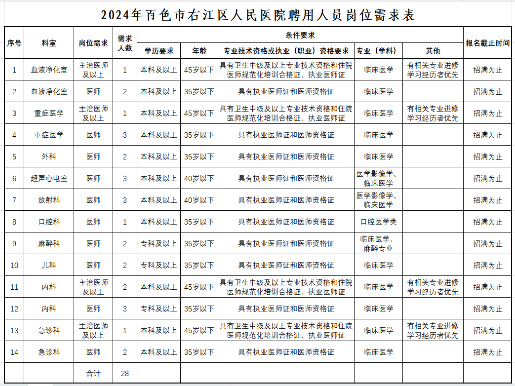 百色市右江區(qū)人民醫(yī)院2024年公開(kāi)招聘工作人員28人公告