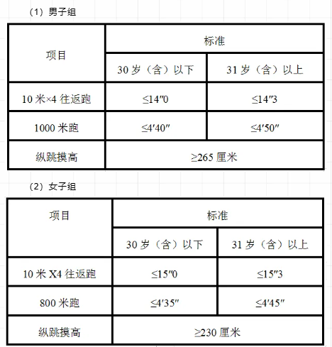 3.參照《關(guān)于印發(fā)公安機(jī)關(guān)錄用人民警察體能測(cè)評(píng)項(xiàng)目和標(biāo)準(zhǔn)(暫行)的通知》(人社部發(fā)〔2011〕48號(hào))的項(xiàng)目及測(cè)試規(guī)則,結(jié)合《公安民警體育鍛煉達(dá)標(biāo)手冊(cè)》成績(jī)標(biāo)準(zhǔn),體能測(cè)評(píng)的項(xiàng)目和標(biāo)準(zhǔn)如下: