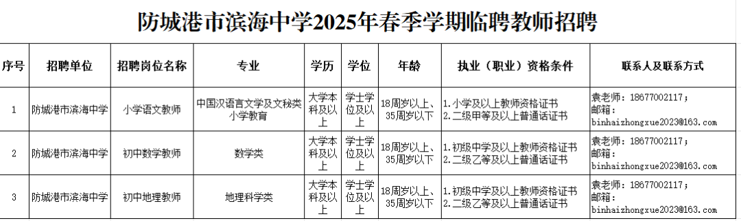 原文標(biāo)題:教師招聘||防城港市濱海中學(xué)2025年春季學(xué)期臨聘教師招聘公告