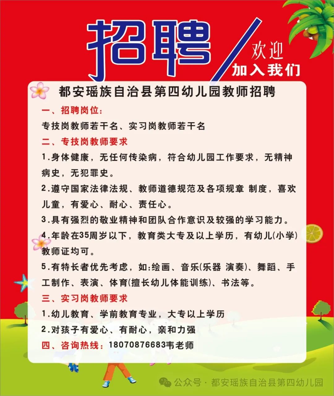 安瑤族自治縣第四幼兒園誠聘教師與廚房工作人員若干人