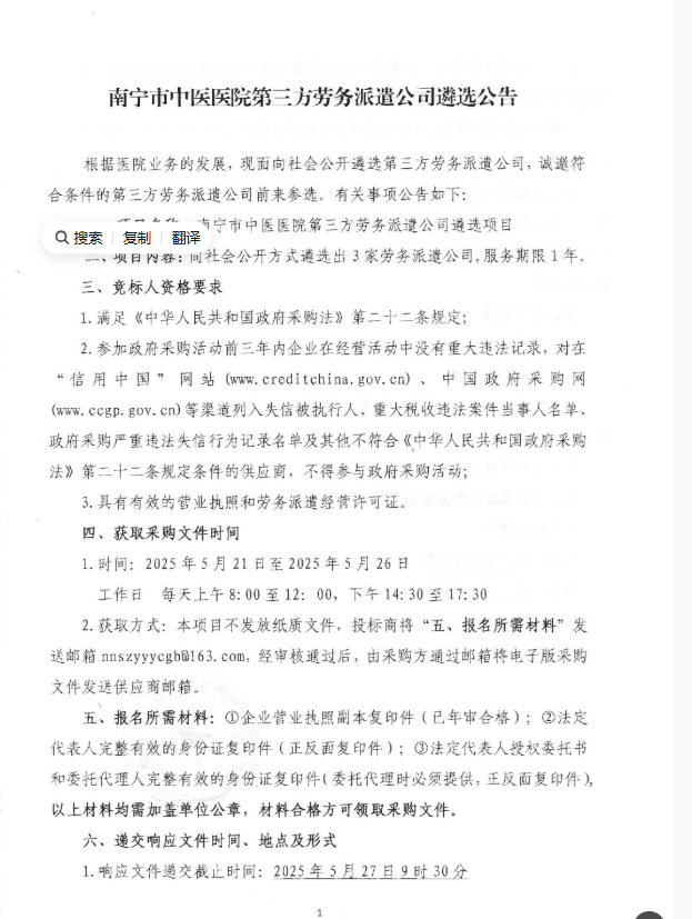 2025年廣西南寧市中醫(yī)醫(yī)院第三方勞務(wù)派遣公司遴選公告