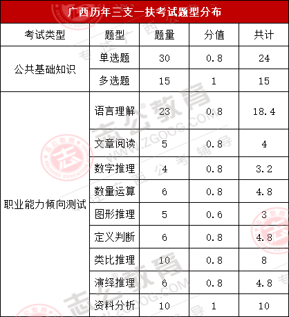 上篇我們寫到,三支一扶的待遇,在廣西這個(gè)待遇還算不錯(cuò),政策上的支持也非常好,那么預(yù)計(jì)這個(gè)月月底出公告的三支一扶,啥時(shí)候筆試呢?2024年廣西三支一扶筆試時(shí)間是7月13日,其筆試科目為《綜合知識(shí)》一科,滿分100分。基于往年考生的回憶,綜合知識(shí)內(nèi)容主要包括公共基礎(chǔ)知識(shí)和行測職業(yè)能力測試兩個(gè)科目,而各題型的題量及分值如下圖所示: