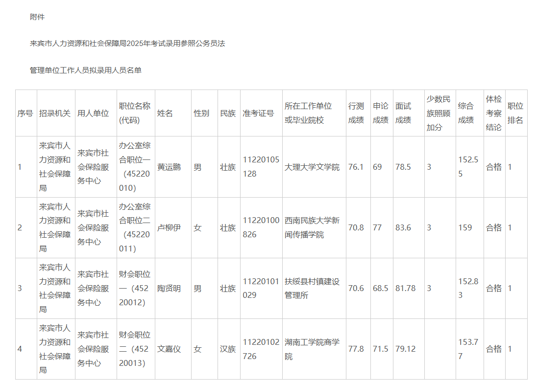 附件:來賓市人力資源和社會保障局2025年考試錄用參照公務(wù)員法管理單位工作人員擬錄用人員名單