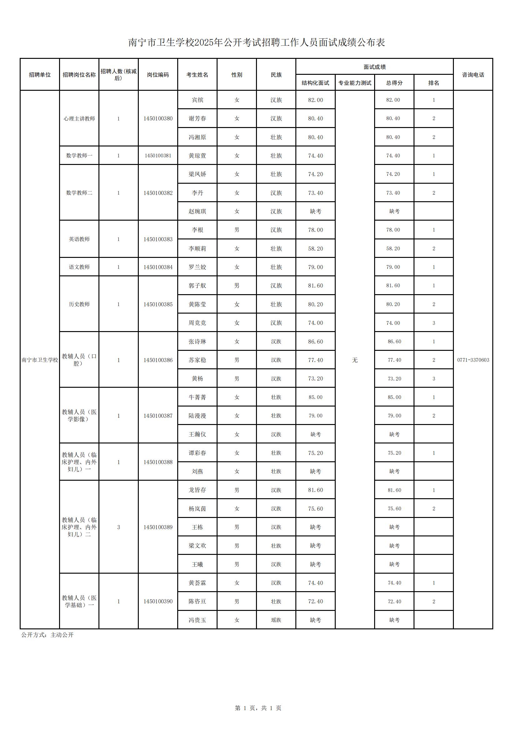 南寧市衛(wèi)生學(xué)校2025年公開考試招聘工作人員面試成績公布表