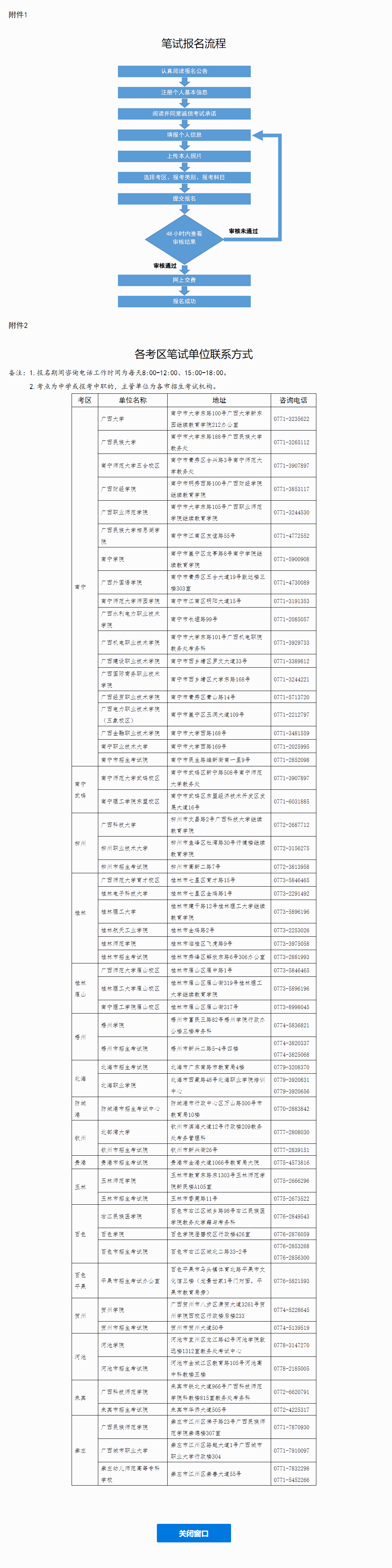 此次筆試共設(shè)17個(gè)考區(qū),分別為:南寧、南寧武鳴、柳州、桂林、桂林雁山、梧州、北海、防城港、欽州、貴港、玉林、百色、百色平果、賀州、河池、來賓和崇左。其中百色平果考區(qū)僅接受幼兒園、小學(xué)教師資格考試的報(bào)名。