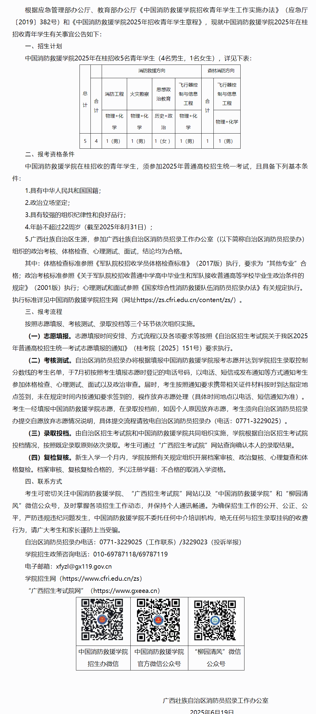 2025年中國消防救援學(xué)院面向廣西壯族自治區(qū)招收青年學(xué)生公告