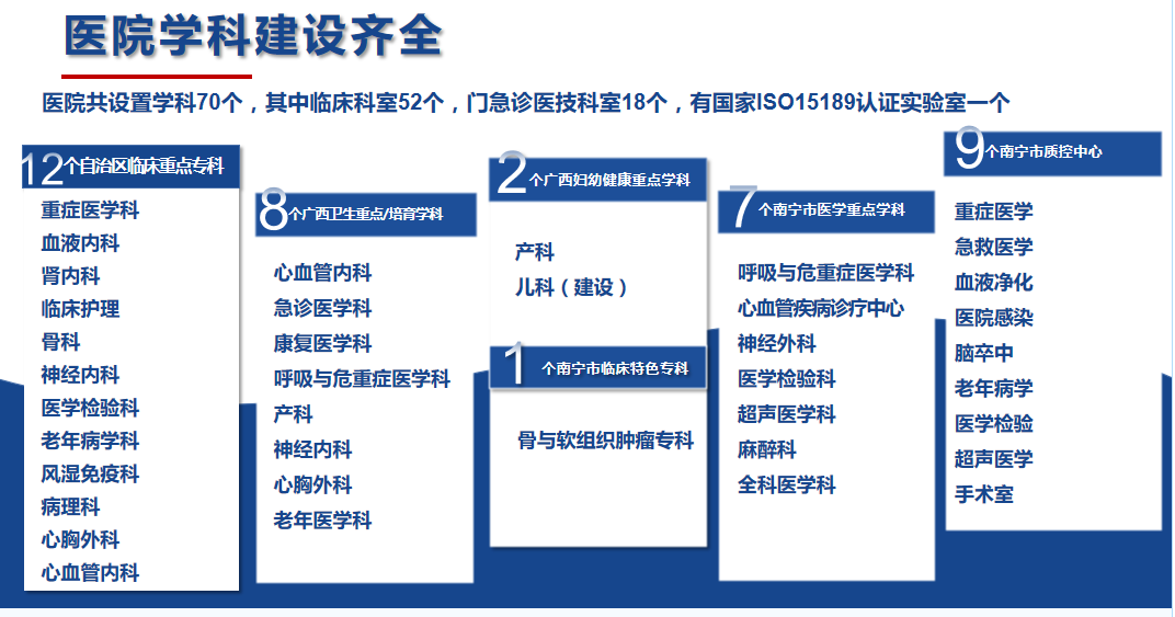 南寧市第一人民醫(yī)院(南寧市兒童先天性心血管疾病研究所、南寧市呼吸道疾病研究所、廣西醫(yī)科大學第五臨床醫(yī)學院、廣西醫(yī)科大學第五附屬醫(yī)院)始建于1914年,是一家擁有百年歷史的國家三級甲等綜合性醫(yī)院。醫(yī)院設有52個臨床病區(qū),18個門診醫(yī)技科室,總開放床位1912張(含分院)。醫(yī)院是國家高級認知中心建設單位及國家神經(jīng)介入建設中心、國家ISO15189醫(yī)學檢驗認證機構,國家聯(lián)盟中心認證的胸痛中心、卒中中心;擁有廣西臨床重點專科(含培育)12個、自治區(qū)醫(yī)療衛(wèi)生重點學科(含培育)8個、自治區(qū)婦幼健康服務重點學科(含建設)2個、南寧市醫(yī)學重點學科7個、南寧市臨床特色優(yōu)勢???個,南寧市質控中心9個。醫(yī)院是國家衛(wèi)健委創(chuàng)面修復能力建設和繼續(xù)教育中心教學基地、國家級住院醫(yī)師規(guī)范化培訓培訓基地,廣西醫(yī)科大學碩士研究生培養(yǎng)基地,同時是暨南大學共建醫(yī)學教育基地、第十批廣西博士后創(chuàng)新實踐基地;醫(yī)院還具備國家藥物臨床試驗機構資質(含I期研究室);醫(yī)院醫(yī)學實驗中心獲批廣西科技廳重點實驗室“廣西智慧精準醫(yī)學實驗室”,是南寧市衛(wèi)健系統(tǒng)唯一的省級重點建設實驗室。2019年在市委市政府支持下,成立南寧市第一人民醫(yī)院醫(yī)療集團。現(xiàn)有27家成員單位,形成“1+4+22”(中心醫(yī)院+4家二級醫(yī)院+22家基層衛(wèi)生及養(yǎng)老機構)一體化格局,推行“三二一”運營管理模式,逐步構建全生命周期健康管理鏈。
