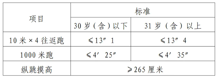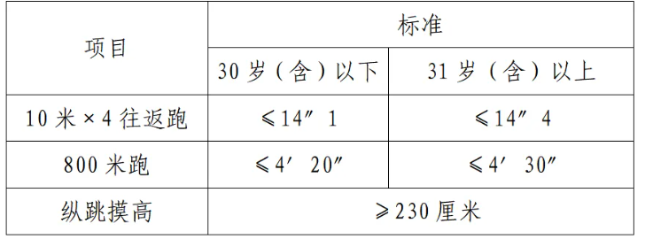 體能測評項(xiàng)目中,縱跳摸高的測試次數(shù)不超過3次,10米×4往返跑測評次數(shù)為2次,1000米/800米的測評次數(shù)均為1次。應(yīng)聘勤務(wù)崗位的人員,體能測評三項(xiàng)全部達(dá)標(biāo)的方為合格;應(yīng)聘文職崗位的人員,體能測評三項(xiàng)有兩項(xiàng)達(dá)標(biāo)的,視為合格。