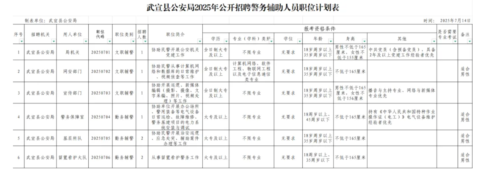 招聘人數(shù):8人,詳見《武宣縣公安局2025年第二次面向社會招聘輔警職位計(jì)劃表》(附件1)。