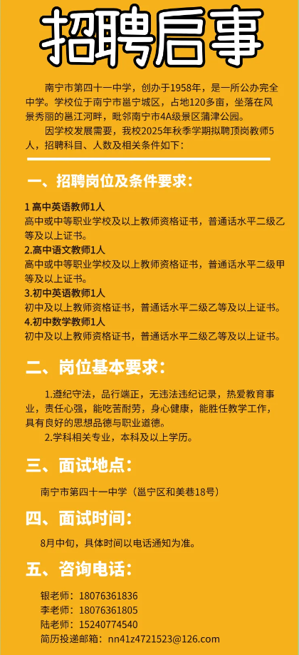 原文標(biāo)題:2025年秋季學(xué)期南寧市第四十一中學(xué)關(guān)于公開招聘頂崗教師的啟事