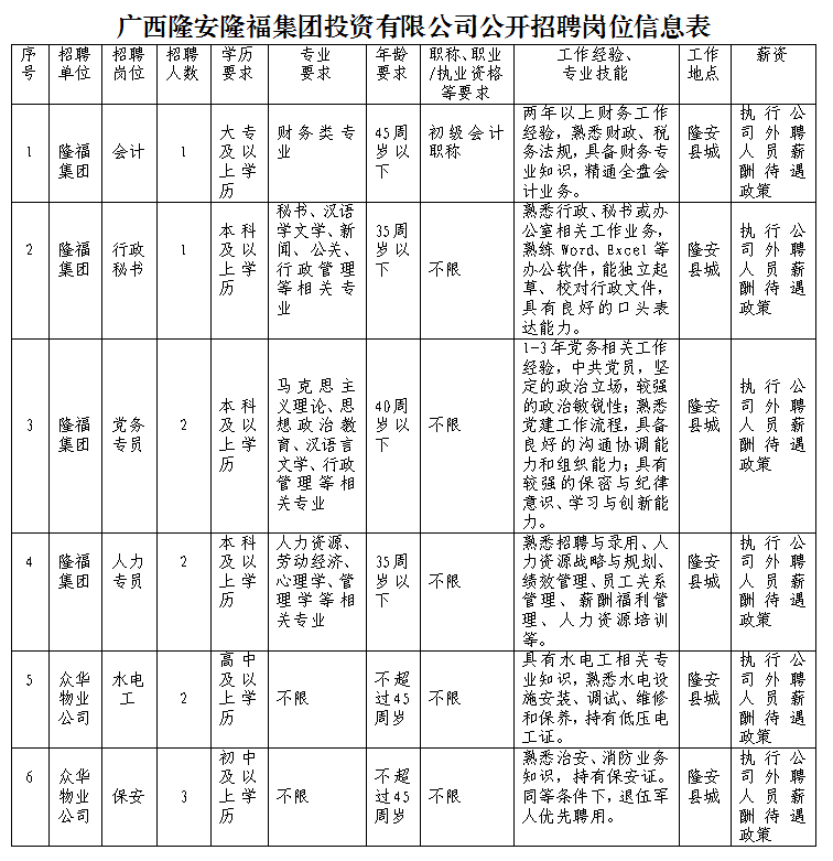廣西隆安隆福投資集團有限公司(以下簡稱“隆福集團”)是隆安縣人民政府國有獨資企業(yè),注冊資本5億元人民幣。負責縣本級基礎設施建設、產業(yè)發(fā)展和公共服務等投融資、建設、運營管理及國有自然資源開發(fā)、建設、運營等工作。因工作需要,現(xiàn)面向社會公開招聘數(shù)名外聘工作人員。