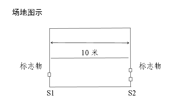 動(dòng)作要求:受測試者采用站立式起跑,聽到發(fā)令后從S1線外跑到S2線前(腳不得踩線)用手將豎立的木塊推倒后折返,往返跑2次,每次推倒1個(gè)木塊,第2次返回時(shí)沖出S1線。