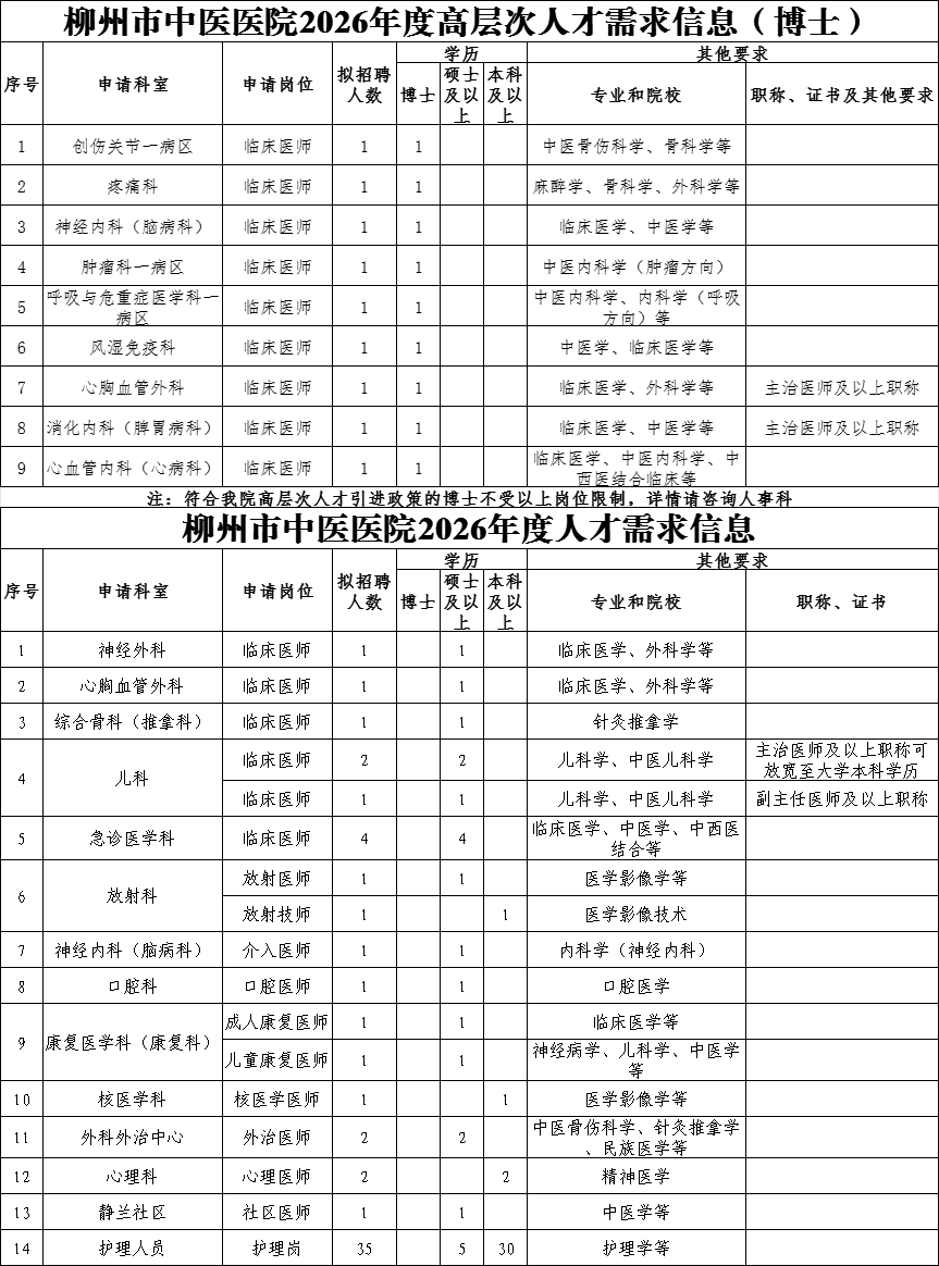 高層次人才不受招聘崗位限制,均可一事一議、一人一議。高層次人才(博士)根據(jù)醫(yī)院引進人才制度,給予25萬-120萬元安家費、5萬-20萬元科研啟動經(jīng)費。引進的高層次人才(高級職稱或博士研究生)按柳州市有關政策提供事業(yè)編制,協(xié)助其解決子女入學和配偶工作。2026年醫(yī)學類緊缺人才擬招聘醫(yī)師7人,緊缺人才科室為心理科(精神衛(wèi)生專業(yè))、神經(jīng)外科、急診醫(yī)學科,擬享受柳州市中醫(yī)醫(yī)院人才引進醫(yī)學類緊缺人才安家費2-20萬元,同時按照國家、廣西壯族自治區(qū)、柳州市及醫(yī)院有關政策享受工資及福利待遇,獎勵性績效工資按照醫(yī)院同級同類人員規(guī)定執(zhí)行。如為學科帶頭人或高層次人才則另按其標準享受相關待遇。