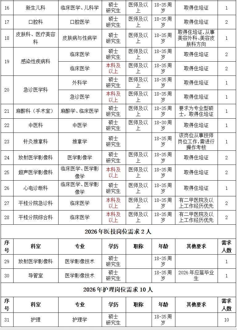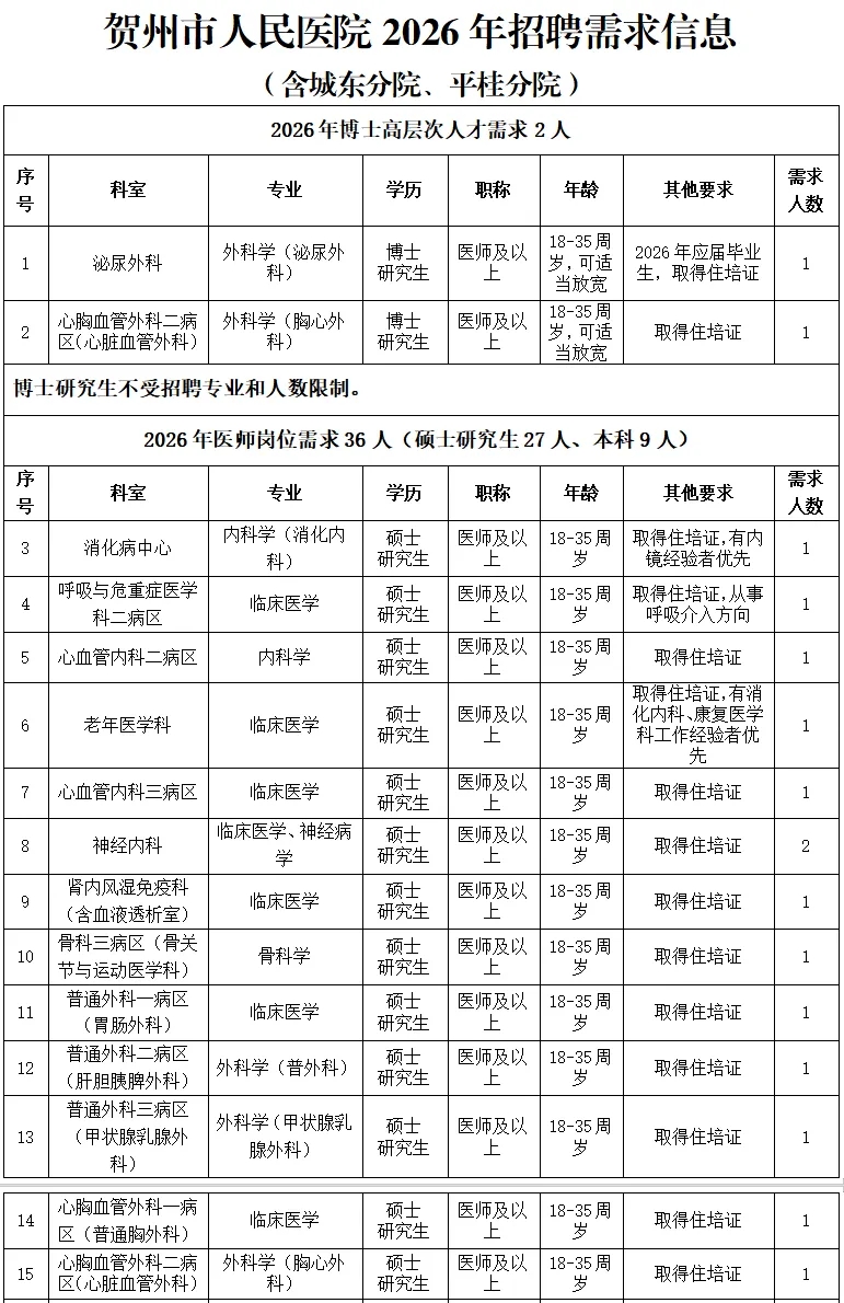 根據(jù)醫(yī)院發(fā)展規(guī)劃,招聘工作堅持公平公正公開,堅持德才兼?zhèn)?、人崗相適、擇優(yōu)錄取、雙向選擇的原則,2026年計劃引進博士、碩士高層次人才及招聘工作人員共計50名(詳見附件:賀州市人民醫(yī)院2026年招聘需求信息)。