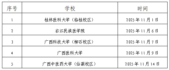 采取現(xiàn)場(chǎng)報(bào)名方式的人員請(qǐng)前往桂林醫(yī)科大學(xué)、右江民族醫(yī)學(xué)院、廣西科技大學(xué)、廣西醫(yī)科大學(xué)、廣西中醫(yī)藥大學(xué)等區(qū)內(nèi)各院校雙選會(huì)現(xiàn)場(chǎng)進(jìn)行應(yīng)聘。廣西區(qū)內(nèi)各院校雙選會(huì)舉辦時(shí)間詳見下表。
