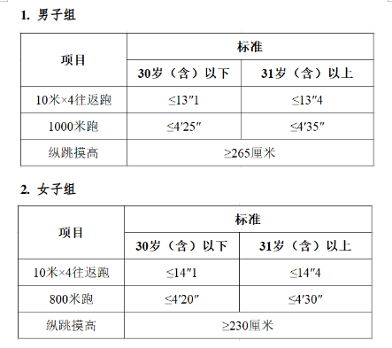 體能測評的項目和標準按照國家有關規(guī)定執(zhí)行,具體如下: