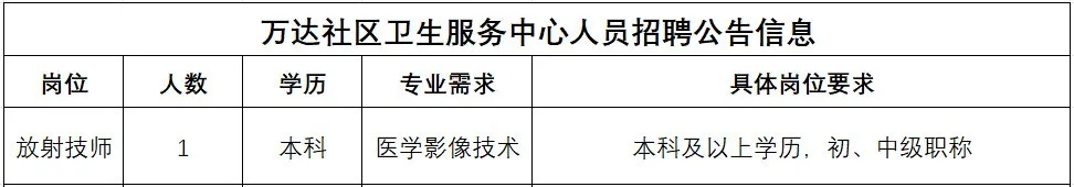 根據(jù)工作需要,銀山街道萬(wàn)達(dá)社區(qū)衛(wèi)生服務(wù)中心現(xiàn)向社會(huì)招聘相關(guān)崗位人員,所有崗位按社區(qū)人員條件招聘,執(zhí)行社區(qū)待遇,具體崗位需求如下: