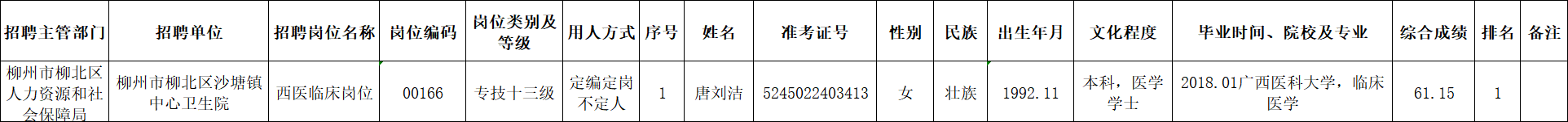 根據(jù)《柳州市2025年度下半年事業(yè)單位公開(kāi)考試招聘工作人員公告》要求及安排,唐劉潔同志經(jīng)面試、考察、體檢合格,符合聘用條件。經(jīng)研究決定,擬聘用唐劉潔同志為我區(qū)事業(yè)單位工作人員,現(xiàn)予以公示,公示期為5個(gè)工作日(2026年1月22日至2026年1月28日)。對(duì)擬聘用的同志如有異議,請(qǐng)以書(shū)面形式,并署真實(shí)姓名和聯(lián)系地址,于2026年1月28日前郵寄或直接送我單位(地址:柳州市柳北區(qū)鷓鴣江六隊(duì)南200米(北外環(huán)路南)柳北區(qū)衛(wèi)生健康局512室;郵編:545002,電話0772-2802642),群眾如實(shí)反映有關(guān)問(wèn)題受法律保護(hù)。