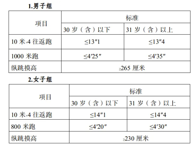 參照《關(guān)于印發(fā)<公安機(jī)關(guān)錄用人民警察體能測評項(xiàng)目和標(biāo)準(zhǔn)>的通知》(公政治〔2024〕60號)執(zhí)行,每個(gè)測評項(xiàng)目分別記錄成績。其中縱跳摸高的測評次數(shù)不超過3次,10米×4往返跑測評次數(shù)不超過2次,男子1000米跑、女子800米跑測評次數(shù)均為1次。