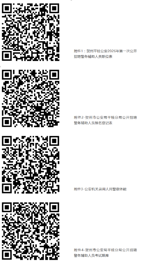 報(bào)考人員自2026年1月26日起,可通過賀州市公共就業(yè)和人才服務(wù)中心“賀州市微就業(yè)”官方微信(gxhzjy)、賀州市公安局平桂分局“平桂警方”官方微信(pggafj)查閱招聘簡章及《職位計(jì)劃表》(附件1)等相關(guān)招聘信息。