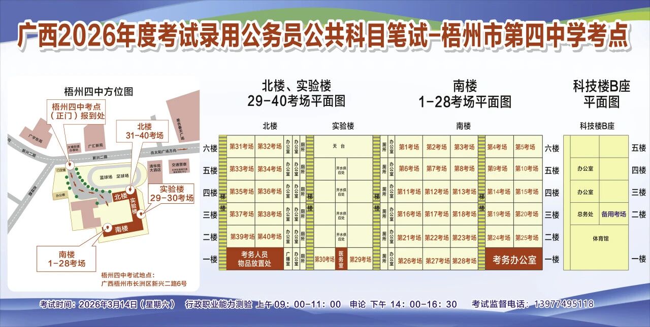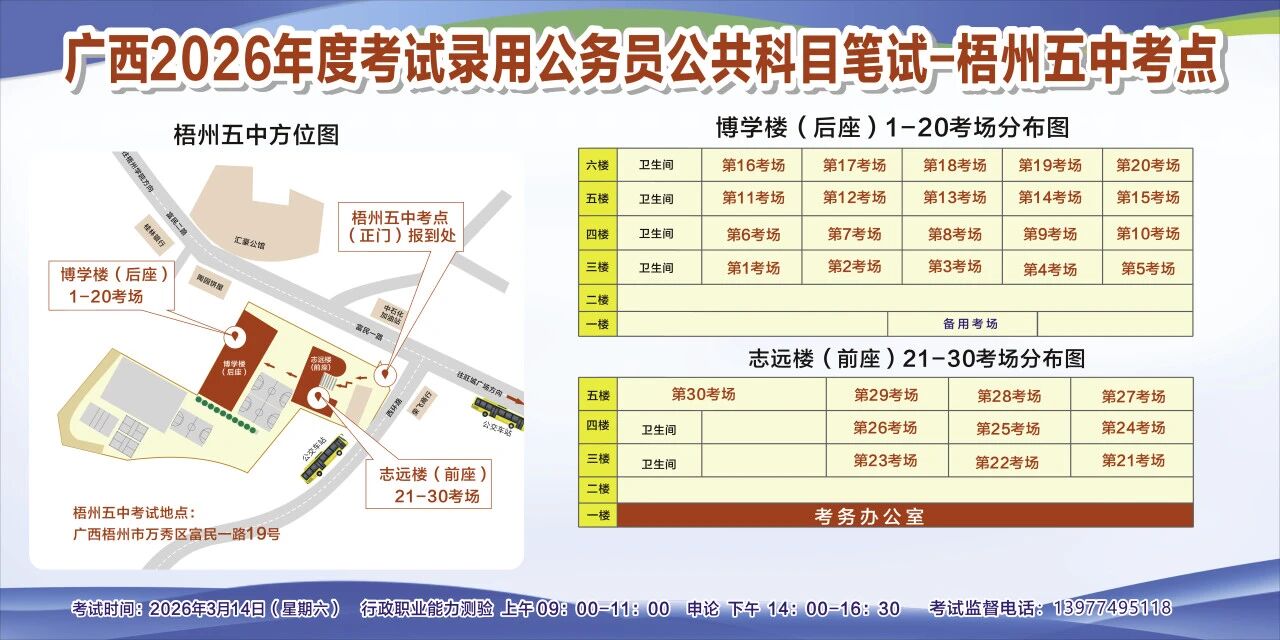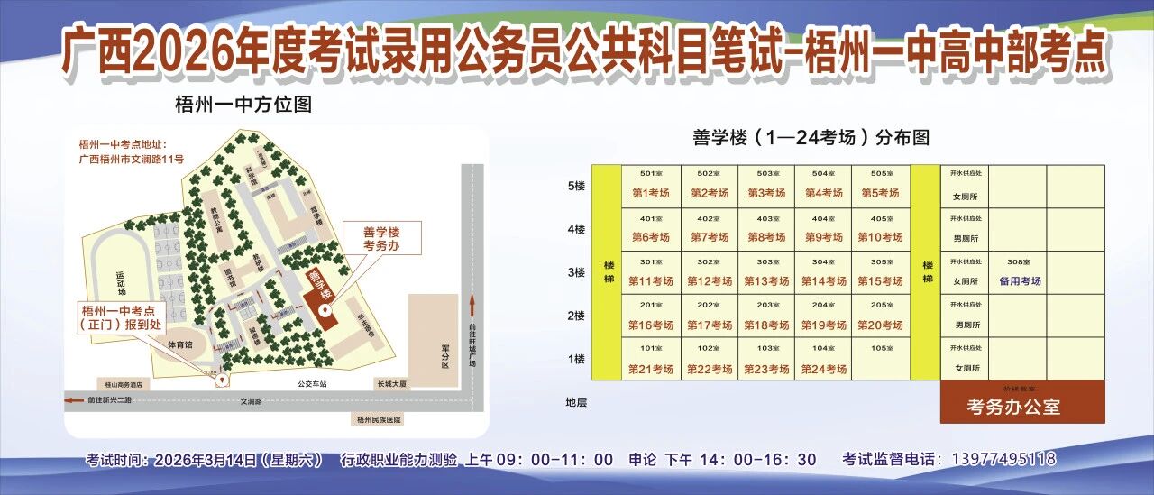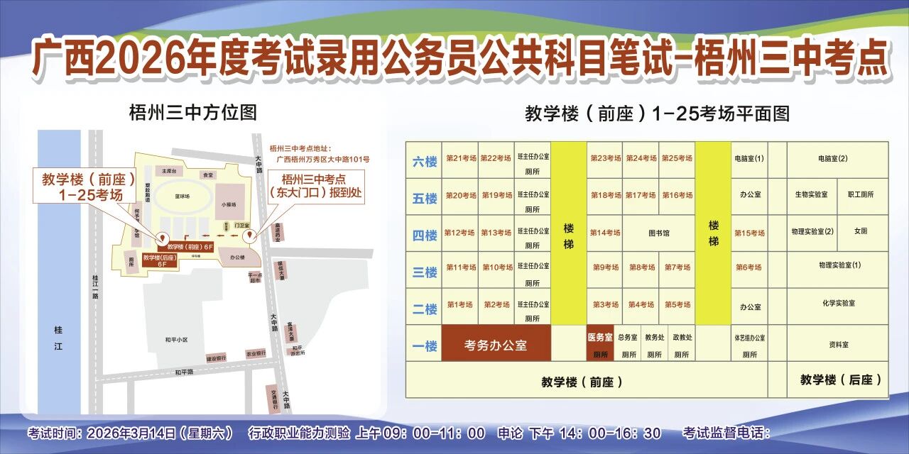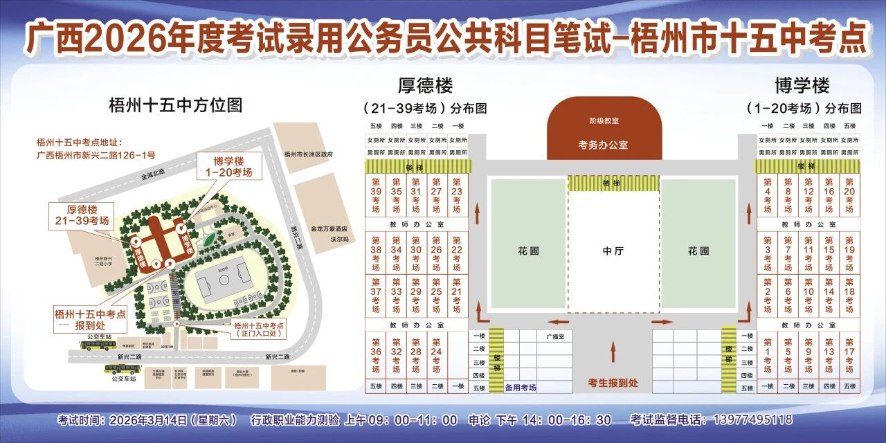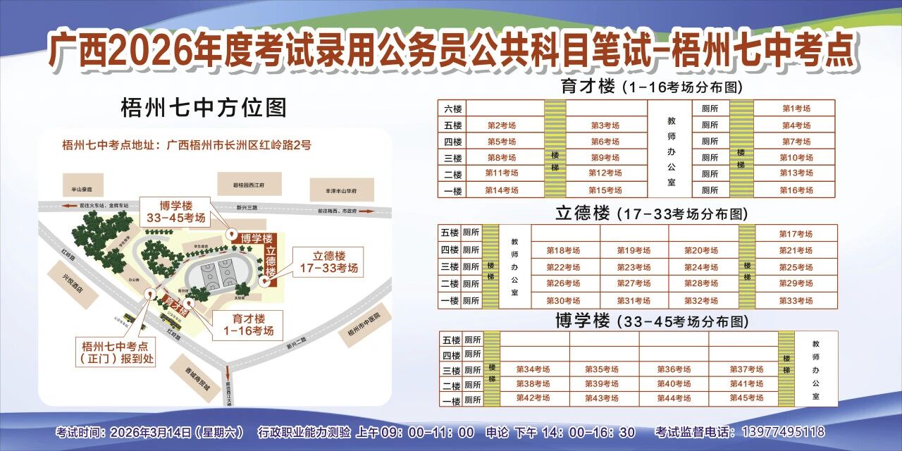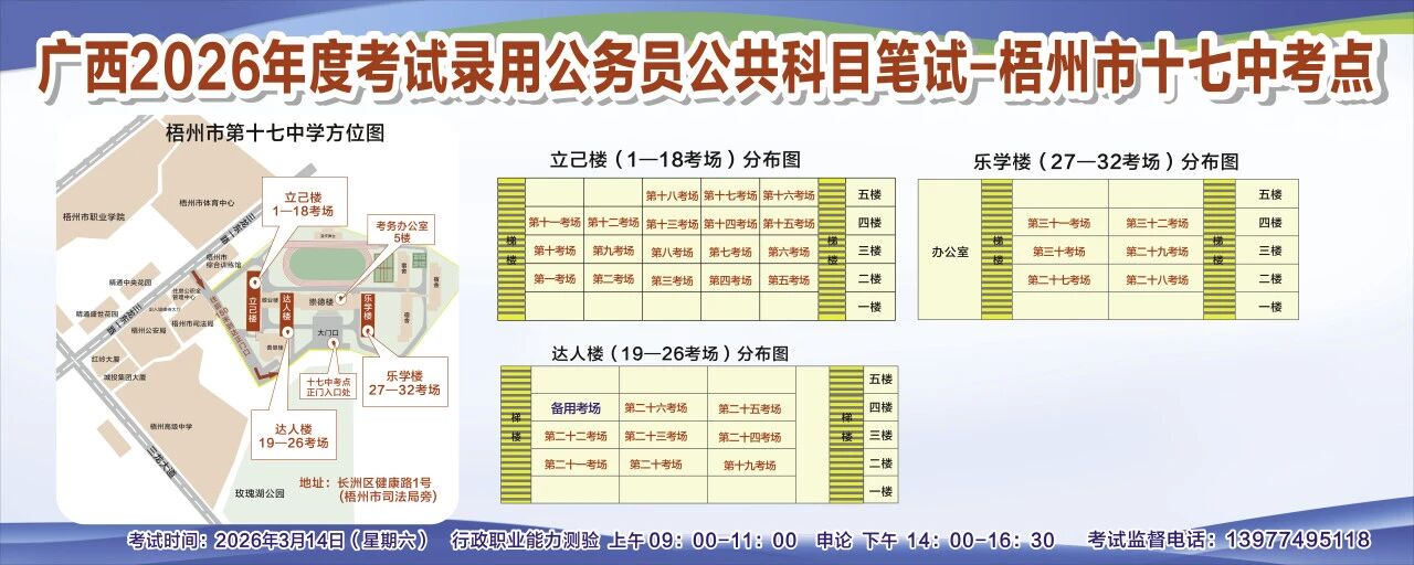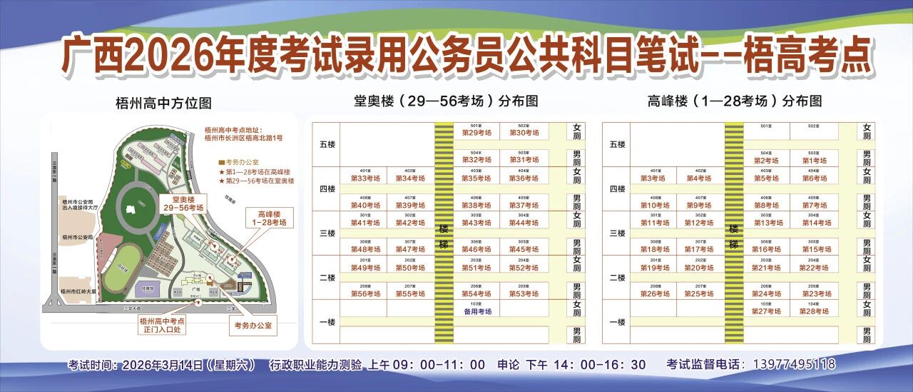 一、廣西2026年度考試錄用公務(wù)員(選調(diào)生)公共科目筆試將于3月14日舉行,梧州考區(qū)共設(shè)置10個考點(diǎn),請考生提前熟悉各自考點(diǎn)位置、周邊環(huán)境及交通情況,考試當(dāng)天提前出門做好準(zhǔn)備,準(zhǔn)時參加考試。