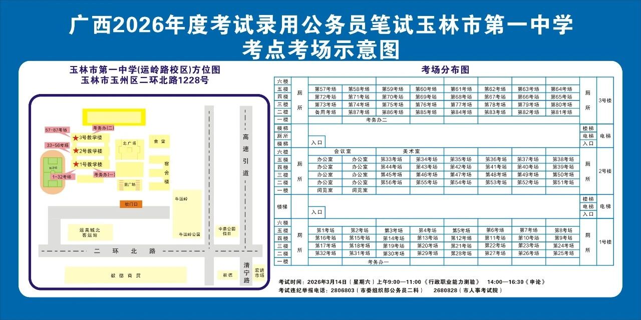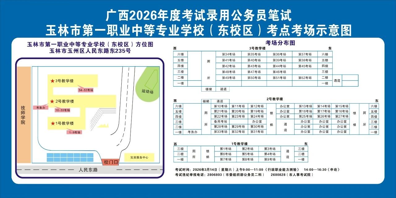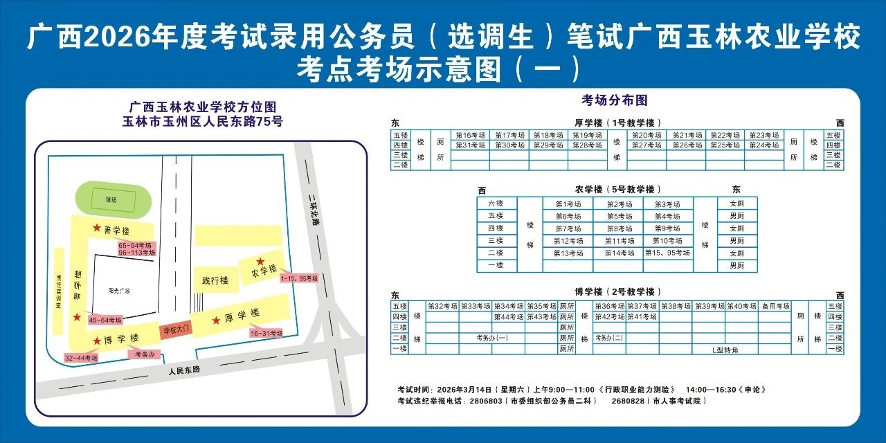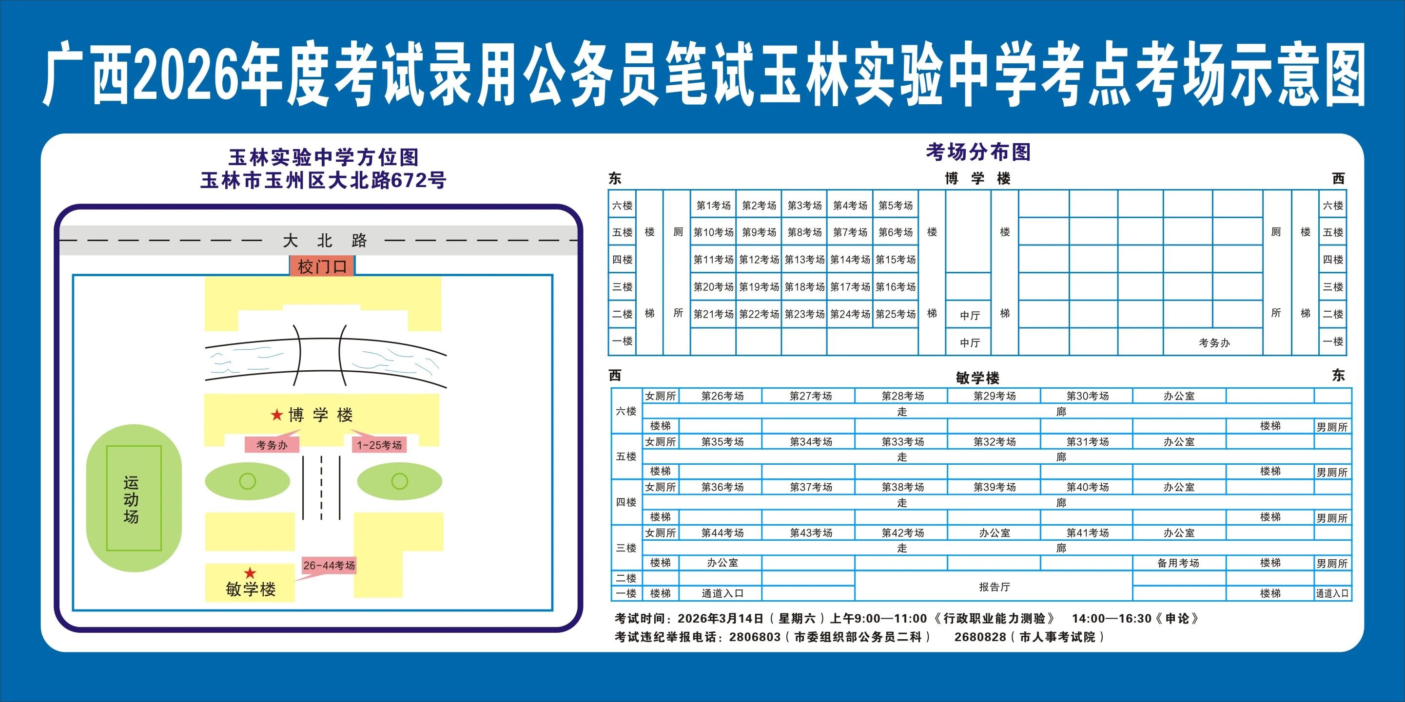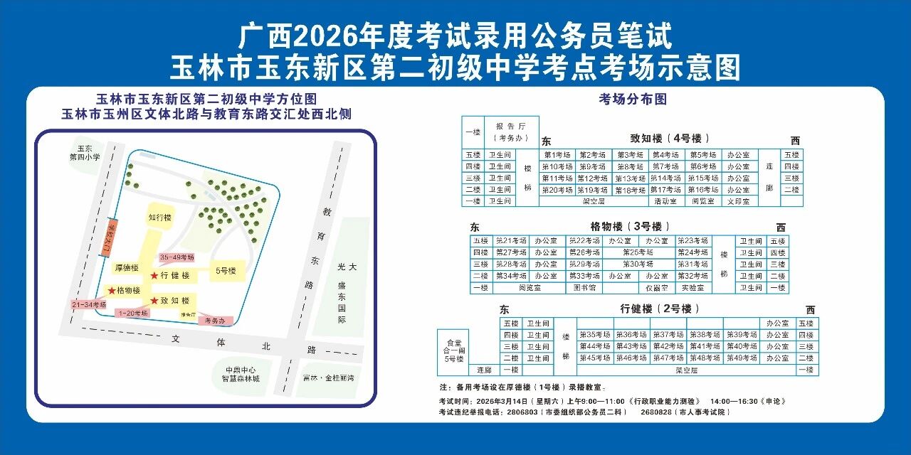 廣西2026年度考試錄用公務(wù)員(選調(diào)生)筆試將于3月14日舉行,為進一步提升玉林考區(qū)服務(wù)保障質(zhì)量,現(xiàn)就有關(guān)注意事項提示如下,請廣大考生做好應(yīng)試準(zhǔn)備工作,準(zhǔn)確掌握考試時間、考點地址及相關(guān)注意事項。